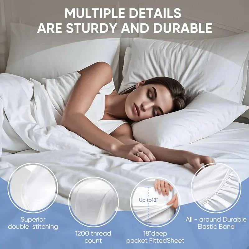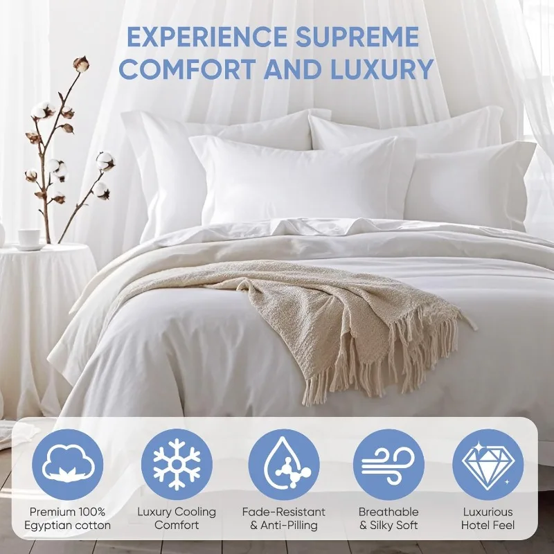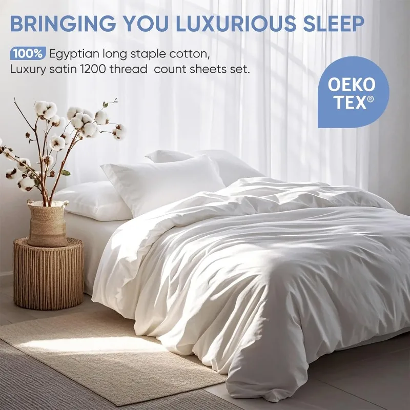 Indulge in the ultimate sleeping experience with this 1200 thread count Egyptian cotton sheet set, crafted from 100% long-staple cotton for unmatched softness and durability. Inspired by luxury hotel bedding, these sheets feature a silky-smooth sateen weave that feels cool, breathable, and inviting against the skin. The deep-pocket fitted sheet is designed to securely fit mattresses up to 18 inches thick, while reinforced seams add extra strength for long-lasting performance. Naturally moisture-wicking and breathable, this set ensures year-round comfort, keeping you cozy in winter and cool in summer. Available in multiple sizes and colors, it’s perfect for elevating any bedroom with timeless elegance. Each set includes a flat sheet, fitted sheet, and pillowcases, offering a complete upgrade to your bedding essentials. Durable, stylish, and luxuriously soft, this Egyptian cotton sheet set transforms your bed into a five-star retreat.