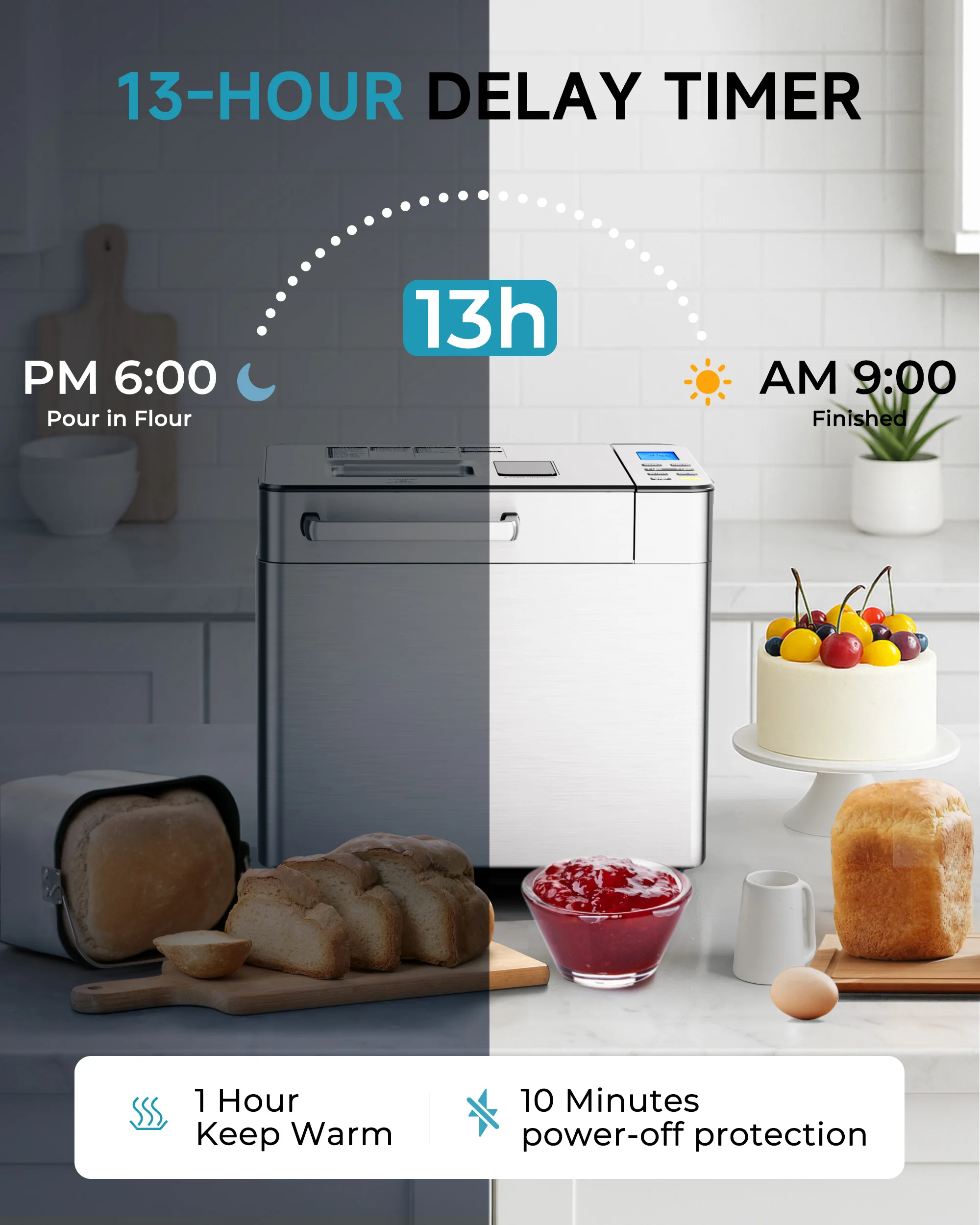 Enjoy fresh, homemade bread with this 2-lb capacity bread maker, designed for convenience and versatility. With 25 automatic programs, 3 bread sizes, and adjustable crust colors, it delivers perfect results every time. Easy to use and complete with a recipe book, this bread maker is ideal for everyday kitchen use and makes a thoughtful gift for home bakers of all levels.