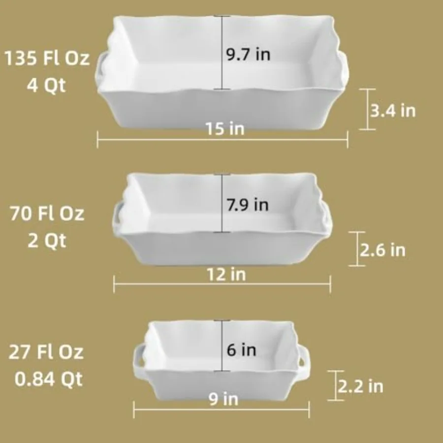Cook, bake, and serve in style with this Ceramic Bakeware Set of 3. Designed with deep sides and elegant wave edges, these rectangular casserole dishes are perfect for lasagna, casseroles, roasts, and desserts. Built-in handles make oven-to-table serving easy, while durable ceramic ensures even heat distribution for perfectly cooked meals every time.